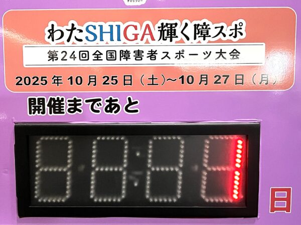 10月24日、第24回全国障害者スポーツ大会(「わたSHIGA輝く障スポ」)の開催までの日数を示すカウントダウンボードの日にちが「1」となりました。10月25日(土)~10月27日(月)、「わたSHIGA輝く障スポ」が開催されます。わたSHIGA輝く国スポ・障スポ実行委員会ならびに同大津市実行委員会のホームページで競技会の情報をご覧いただけます。
